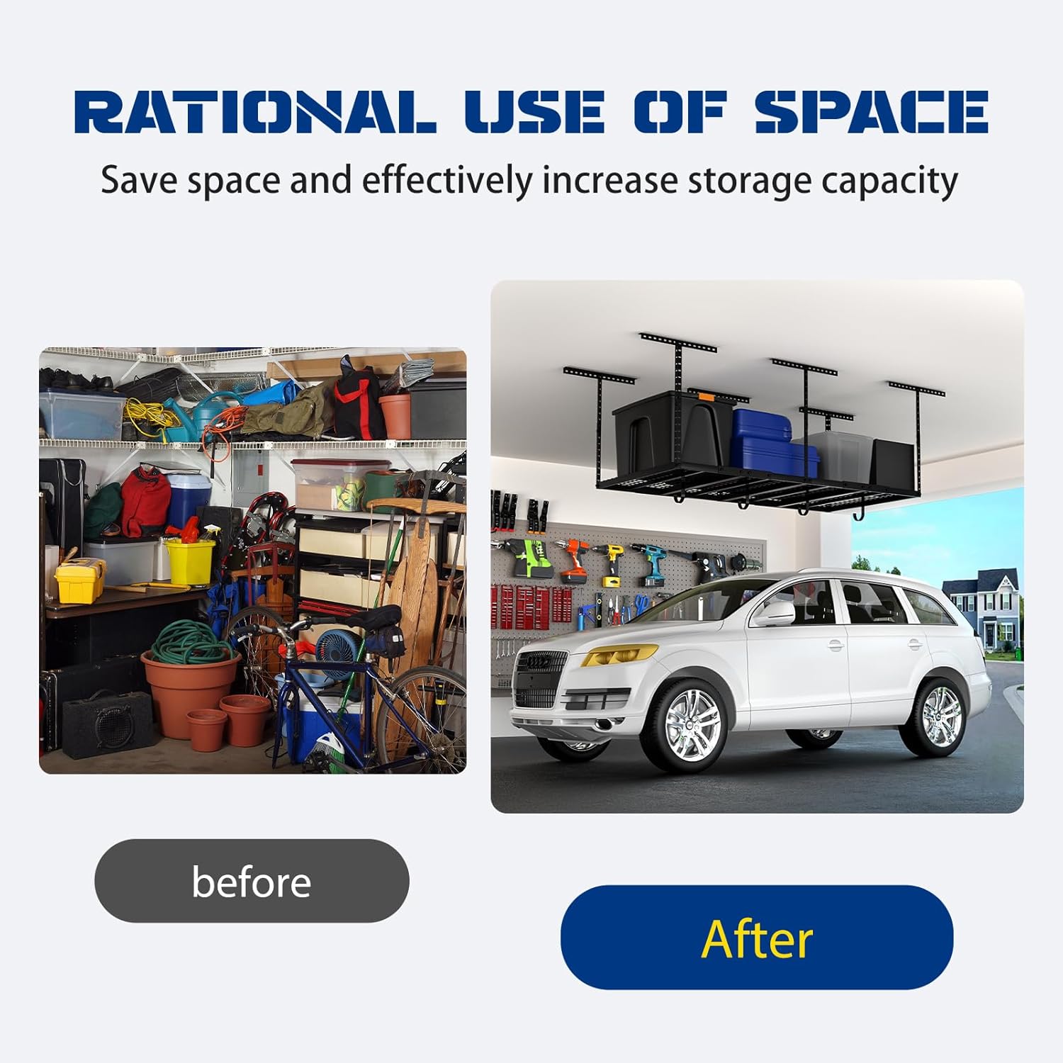4x8 Overhead Garage Storage Rack with 4 Extra Hooks – Adjustable Heavy-Duty Garage Ceiling Storage Racks (22"-40"), Holds 600 lbs, 22 lbs per Hook, Steel Hanging Organizer for Tools, Bins & Bikes
