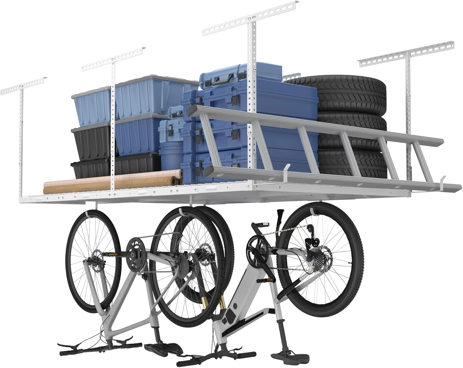 FLEXIMOUNTS 4x8 Overhead Metal Garage Storage Rack w/Hooks Adjustable Ceiling Storage Rack, 96" Length x 48" Width x 40" Height, 22''-40" Ceiling Dropdown, Black