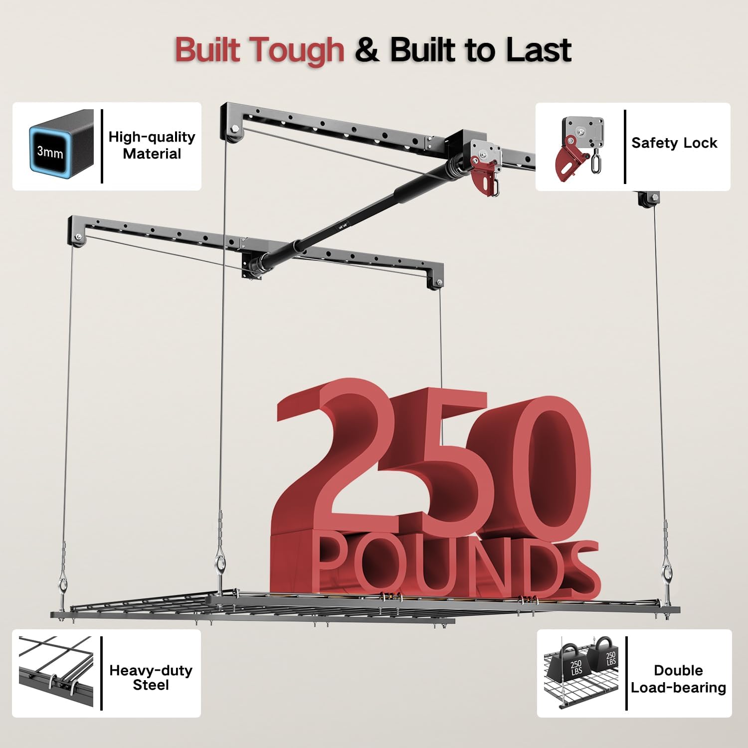 Overhead Garage Storage Rack for 8-10 FT Ceiling, 4x4 FT Ceiling Storage Racks with Safety Lock, Ideal for Garage Storage Mounted Lift System and Storage Organizer, 250lbs Capacity