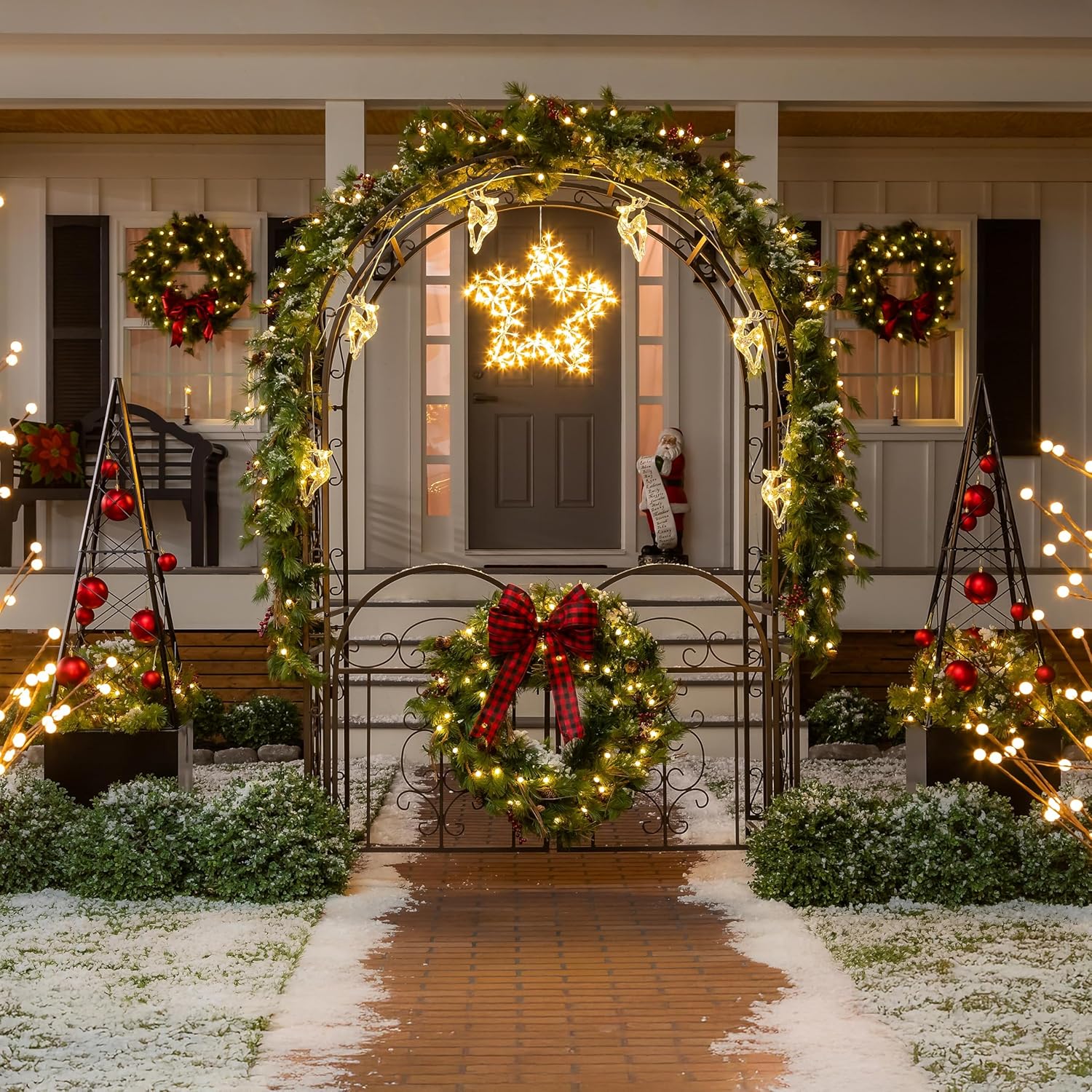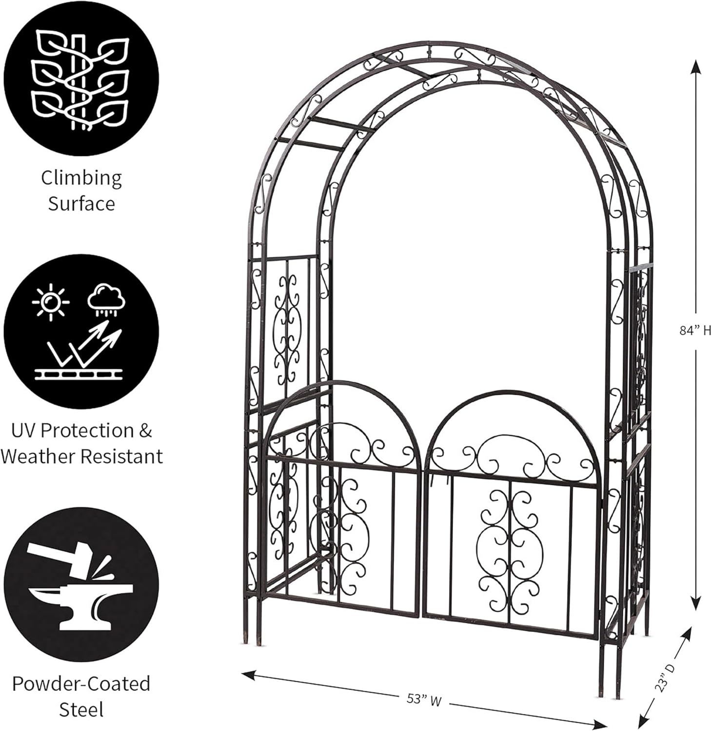 Plow & Hearth Arch Metal Outdoor Garden Arbor Double Gate | Montebello | 7 Feet Tall | Gunmetal Black | Trellis Lattice Climbing Plants