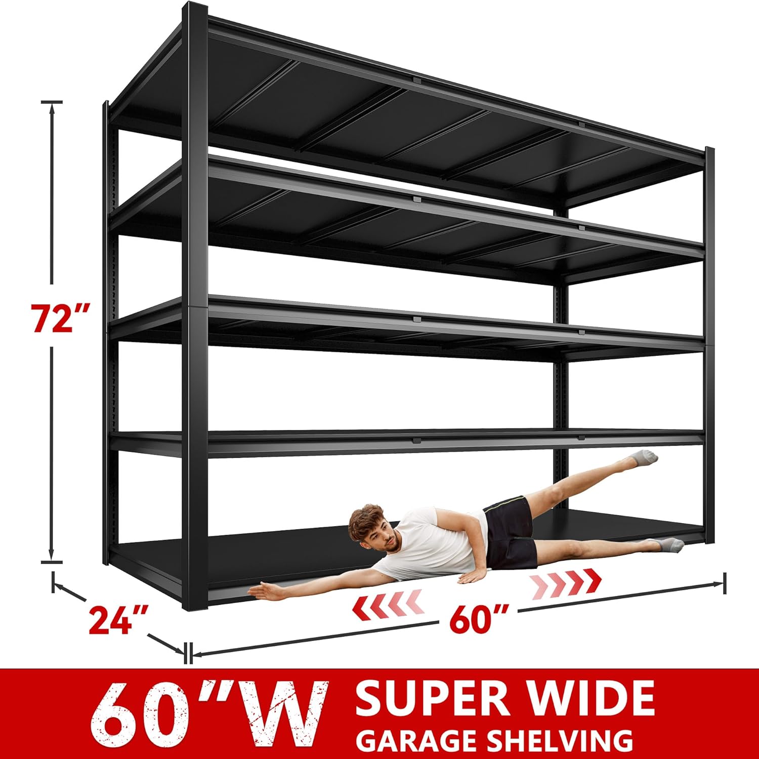 REIBII 60" W Garage Shelving 3000LBS Garage Shelving Heavy Duty Storage Shelves, 5 Tier Metal Shelves, Adjustable Industrial Shelf for Warehouse, Basement, Pantry, 60" W x 24" D x 72" H