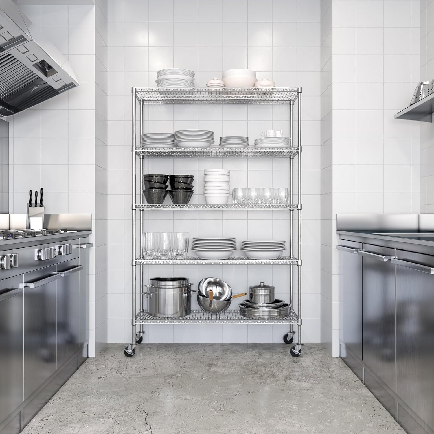 Organize your home or office with Seville Classics 5-Tier UltraDurable Commercial-Grade NSF-Certified Steel Wire Shelving System. This system is constructed from industrial-strength steel and features plated steel for protection against corrosion in dry and heated storage. Our shelves have passed NSF certification and are suitable for commercial, home and office environments. Systems are built with heavy-duty use in mind and can store up to 800 lbs. per shelf. Roll the unit from room-to-room with the included casters for storage that goes where you do. Industrial-strength steel wire construction for multipurpose storage plating provides necessary corrosion resistance in dry environments Certified by the NSF to NSF/ANSI Standard 2 - Food Equipment for use in dry environments Wheels allow for easy positioning in the kitchen, garage, or office Shelves adjust at 1" increments Includes 4 wheels (with 2 locking) and leveling feet No tools required for assembly Limited 10-year Dimensions: 48" W x 18" D x 72" H (75" H with wheels) Capacity on leveling feet: 800 lbs. per shelf Total system capacity on leveling feet: 4000 lbs. Total system capacity on wheels: 500 lbs. Weight: 78. 3 lbs. Model #: WEB562
