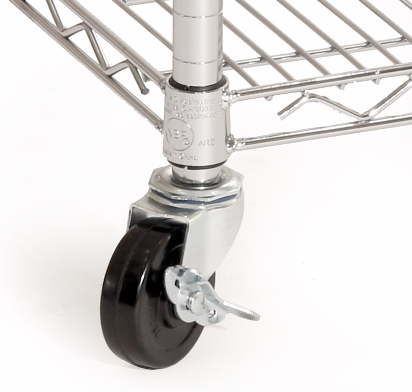 Organize any space with Seville Classics UltraDurable® 5-Tier Commercial-Grade NSF-Certified Steel Wire Shelving System. This heavy-duty shelving is constructed from industrial-strength steel and measures 60” wide by 18” deep by and 75” high fully assembled on wheels (72” high on leveling feet). The 5 shelves and 4 poles are plated steel for protection against corrosion in dry environments. Shelves are adjustable in 1” increments. Includes four 3” heavy-duty rubber wheels and four adjustable leveling feet. NSF Certified - NSF/ANSI Standard 2 - Food Equipment for commercial and restaurant use. This shelving system can store up to 800 lbs. per shelf on leveling feet (4,000 lbs. total). On wheels this shelving system can store up to 500 lbs. total. No tools are required for assembly.